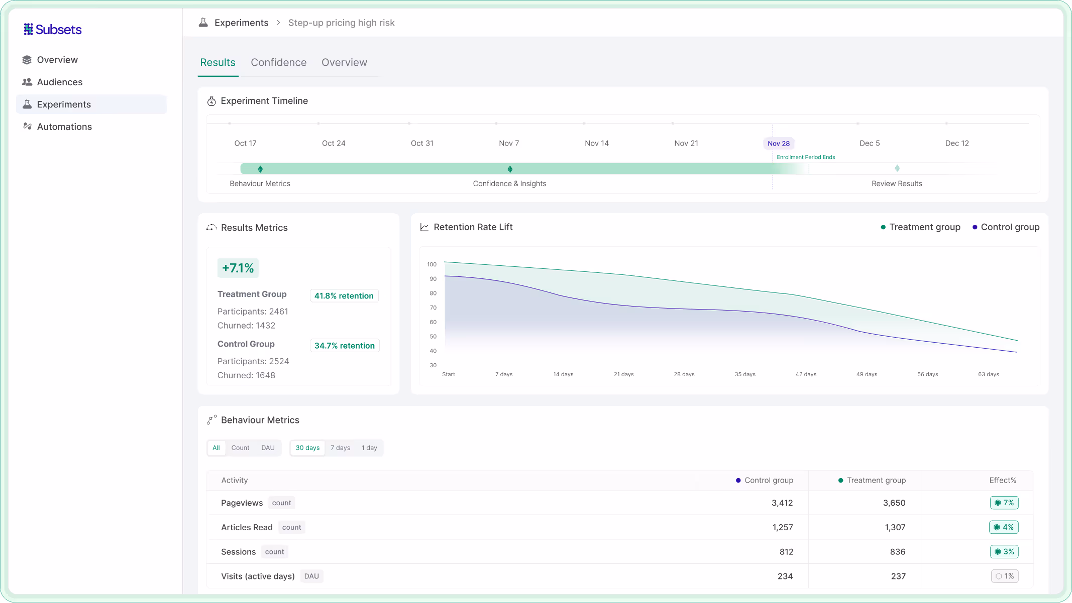 Run experiments on predictive subscriber audiences directly through your existing channels and tools. Experiment with retention, engagement, and upsell strategies while tracking the impact in real-time, automatically within Subsets.