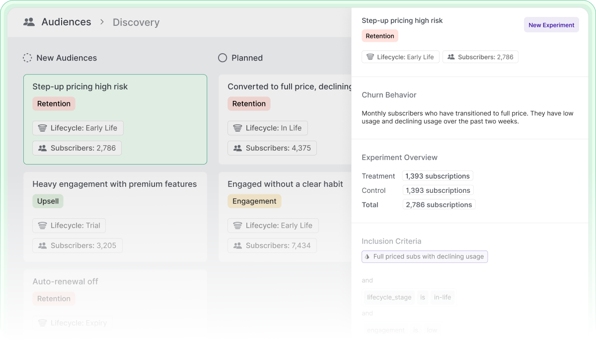 Run experiments on predictive subscriber audiences directly through your existing channels and tools. Experiment with retention, engagement, and upsell strategies while tracking the impact in real-time, automatically within Subsets.
