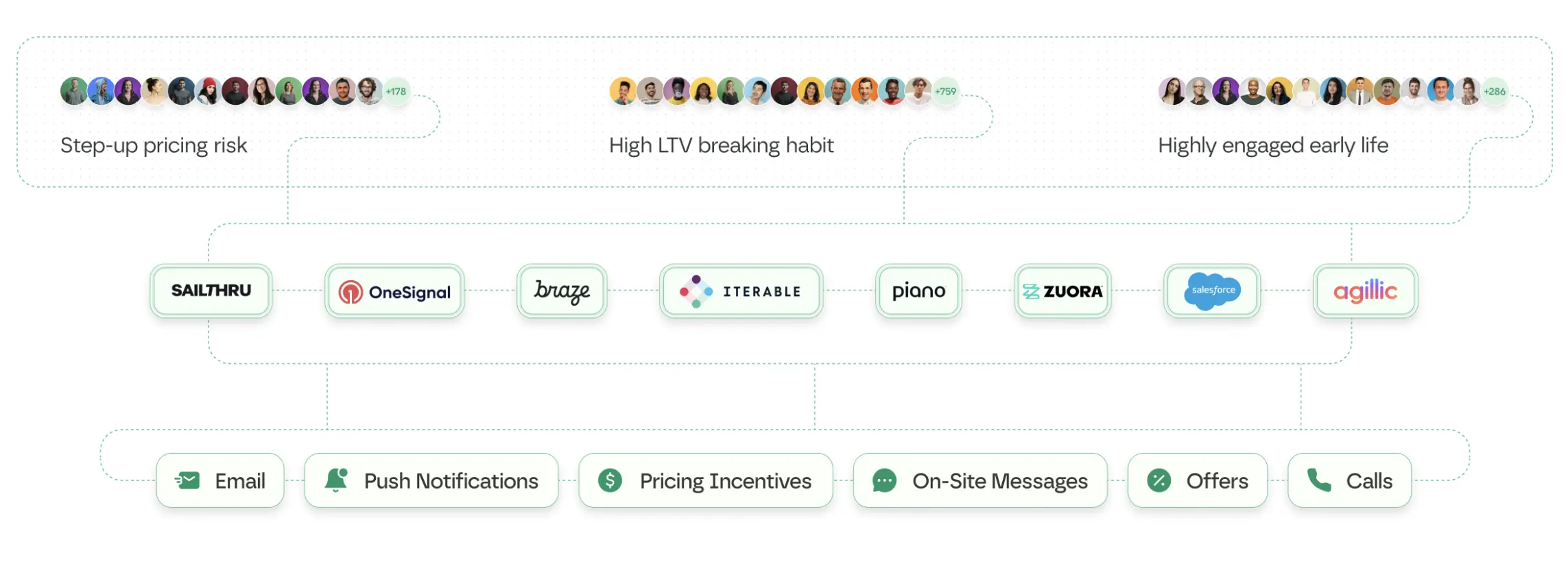 Engagement strategies include regular communication that highlights unused features, personalized recommendations based on usage data, and creating feedback loops that demonstrate you're listening to customer needs. For example, one of our customers achieved a 14% engagement lift from tenured subscribers with declining usage and 4.7% retention lift from re-engaging dormant subscribers.