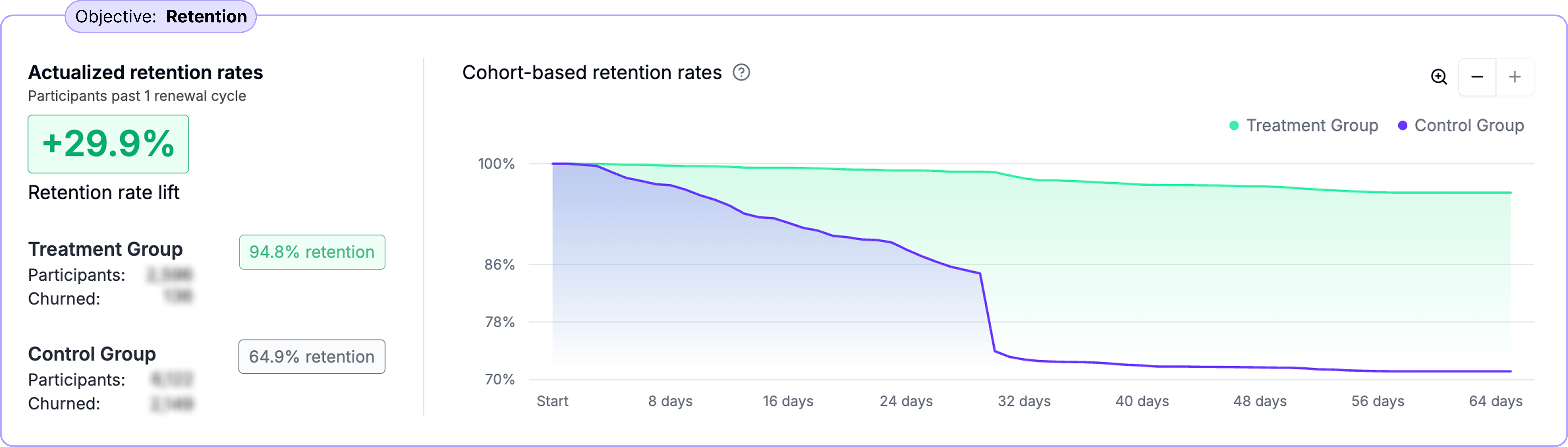 Experiment KPIs as shown on the Subsets platform (Example with a Retention objective)